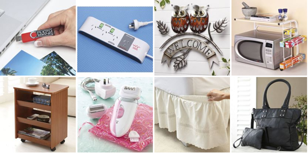 - Home: Such as tables, clocks, home office products, decorative and lighting, furniture protectors, laundry and cleaning products, storage, and exercise equipment